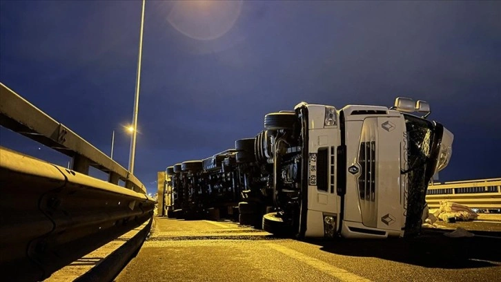 M.C. idaresindeki 27 HG 628 plakalı tır, otoyolun İzmit Doğu gişeleri bağlantı yolunda devrildi.