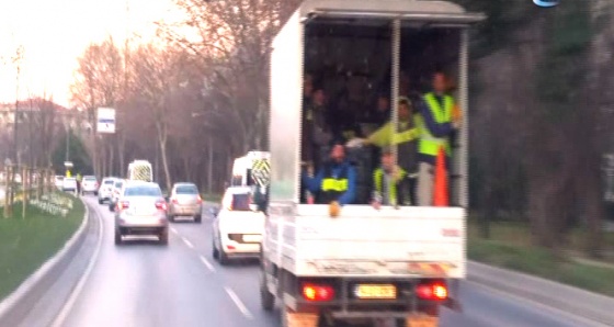 Ataköy`de sabah saatlerinde cep telefonu kameralarına yansıyan bir görüntü İstanbulluların tepkisine neden oldu. İstanbul Büyükşehir Belediyesi'ne ait bir kamyonet kasasında çevre düzenleme çalışması yapan işçilerin yaptığı tehlikeli yolculuk kameralara yansıdı. Hızla akan trafikte şerit değiştirerek ilerleyen aracın kasasındaki işçiler ölümle burun buruna yolculuk yaptı. Soğuk havaya rağmen işçilerin aynı kasada yaptığı tehlikeli yolculuk amatör bir kamera tarafından görüntülenirken aracın sürekli şerit değiştirdiği görüldü.Bu görüntüyü gören vatandaşlar da duruma tepki gösterdi.