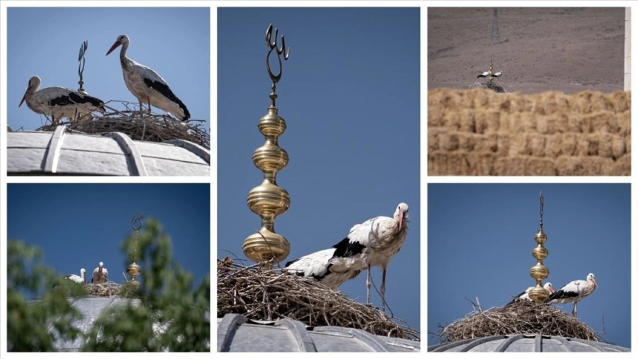 Erzurum'un Aziziye ilçesine bağlı kırsal mahalleye gelen leylekler cami kubbesindeki "alem"in altına yıllardır yuva yapıyor.