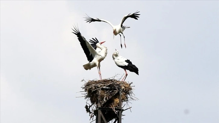 Göç ettikleri bölgelerden kente gelen leylekler, elektrik direği, cami kubbeleri ve evlerin çatısına yaptıkları yuvalarına yerleşiyor.