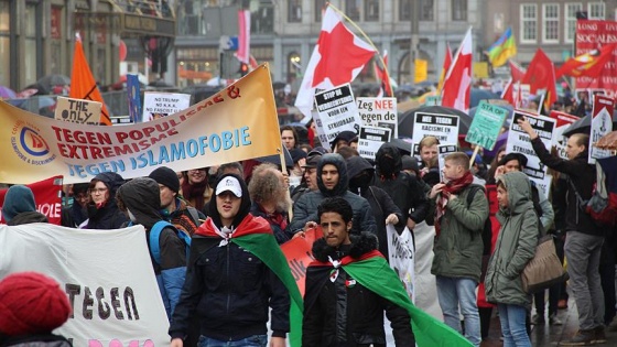 Amsterdam kentindeki De Dam Meydanı'nda bir araya gelen göstericiler, Dokwerker Meydanı'na kadar ellerindeki, "ırkçılık ve ayrımcılığa karşı hep beraber", "mültecilere kapımız açık", "Wilders’e hayır, PVV partisine hayır, ırkçılığa hayır", "duvarlar yıkılsın", "popülizme ve İslamofobiye karşı" yazılı pankartlarla müzik eşliğinde yürüyüş yaptı.