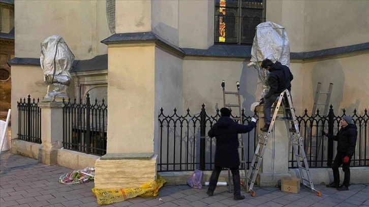 Lviv şehir merkezinin ortasında yer alan Meryem Ana Kilisesi'nin çevresindeki heykeller, herhangi bir saldırı ihtimaline karşı korumaya alındı.