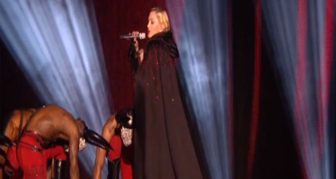 Şarkıcı Madonna şarkı söylerken sahnede düştü.