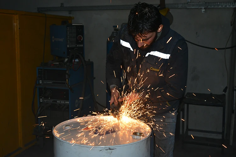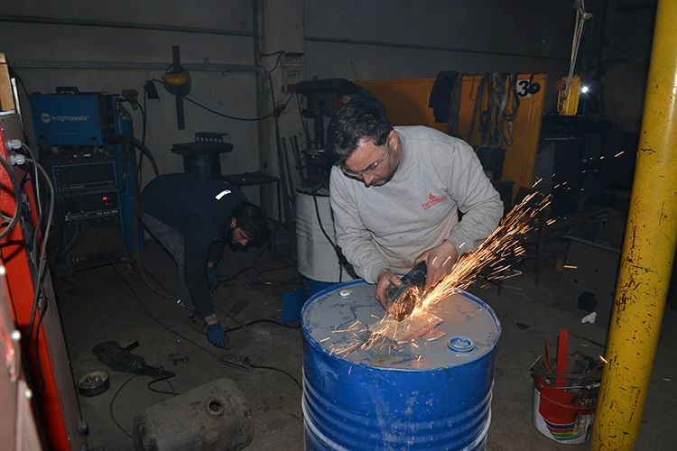 Firma çalışanları, çevredeki işletmelerden topladıkları varillerle depremzedelerin ve arama kurtarma ekiplerinin ısınma ihtiyacını gidermek üzere sokak sobası üretiyor.