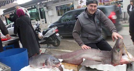 Bursa'nın Mudanya ilçesindeki balıkçılar tarafından Marmara Denizi'nde yakalanan camgöz cinsi köpek balığı balıkçı tezgâhlarında ilgi odağı oldu.