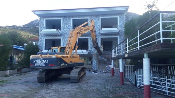 Çevre ve Şehircilik İl Müdürlüğü ve Marmaris Belediyesi Fen İşleri Müdürlüğü ekipleri, kaçak olduğu gerekçesiyle yıkım kararı verilen Söğüt Mahallesi'ndeki yapıların yıkım çalışmalarına devam etti.