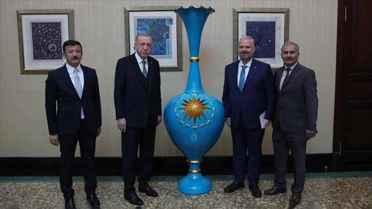 Menemen Belediyesinden yapılan açıklamaya göre, çömlek ustası Ahmet Taşhomcu ile Belediye Başkan Vekili Aydın Pehlivan, Cumhurbaşkanı Erdoğan'ı AK Parti Genel Merkezi'nde ziyaret etti.