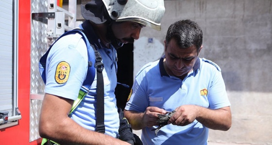 Bölgeye gelen itfaiye ekipleri, merdivenli araç yardımıyla ayağı ipe dolanan ve kopmak üzere olan kuşu kurtardı.