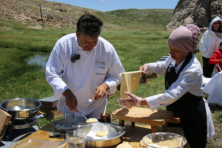 Daha sonra yaylada kurulan mini mutfakta tezgah başına geçen Chinali, yaylanın adını alan ve 2019'da Kanada'nın Montreal kentinde düzenlenen 46. Dünya Arıcılık Kongresi'nde "Dünyanın En İyi Balı" ödülüne layık görülen Eğriçayır balı ile "Seadas" adı verilen tatlı yaptı.