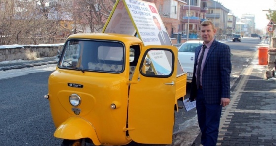 Kayseri'de, 31 Mart'ta yapılacak muhtarlık seçimlerinin yaklaşması ile muhtar adayları da seçim çalışmalarını hızlandırdı. Kocasinan ilçesine bağlı Yeni Mahalle'de de muhtar adayı olan 38 yaşındaki Ali Akbulut, restorasyonunu kendi yaptığı triportör ile mahalleyi gezerek, kendisi için oy istiyor.