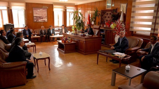 Hakkari'deki mahalle muhtarları, İçişleri Bakanlığınca Kanun Hükmünde Kararname (KHK) ile Hakkari Belediye Başkanı olarak görevlendirilen Vali Yardımcısı Cüneyt Epcim'i belediyedeki makamında ziyaret etti.