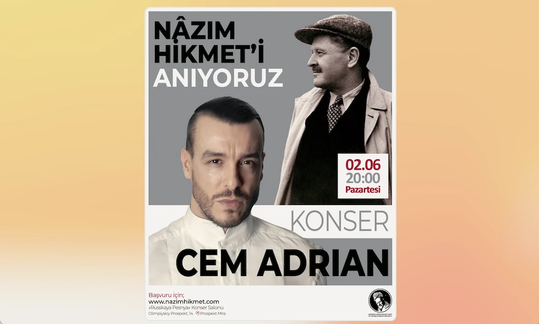 2 Haziran Pazartesi akşamı ünlü sanatçı Cem Adrian, gerçekleştireceği akustik konserle ve Nâzım Hikmet anısına derlenen özel repertuarıyla Moskova’da bizlerle olacak.