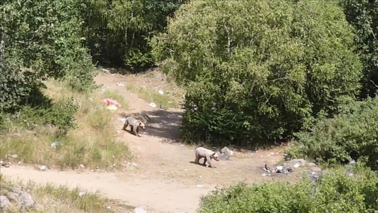 Dron ile görüntülenen bozayılar, zaman zaman çöp konteynerlerinde yiyecek ararken görülüyor.