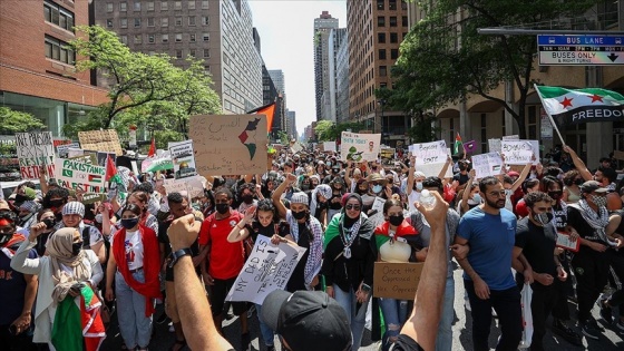 Manhattan 2. Cadde'deki Başkonsolosluk binası önünde toplanan göstericiler, özgür Filistin çağrısı yapan ve işgal altındaki Doğu Kudüs ve Gazze'de devam eden İsrail saldırılarının sona erdirilmesine yönelik pankartlar taşırken, New York polisi (NYPD) İsrail Başkonsolosluğunun çevresinde geniş güvenlik önlemleri aldı.
