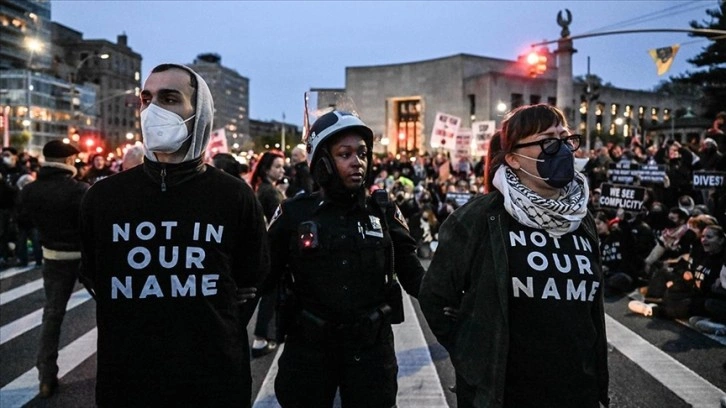 Sosyal medyaya yansıyan görüntülerde, İsrail'in Filistin'e yönelik saldırılarının son bulmasını isteyen ve aralarında Yahudilerin de bulunduğu katılımcıların kelepçelenerek olay yerinden uzaklaştırıldığı görüldü.