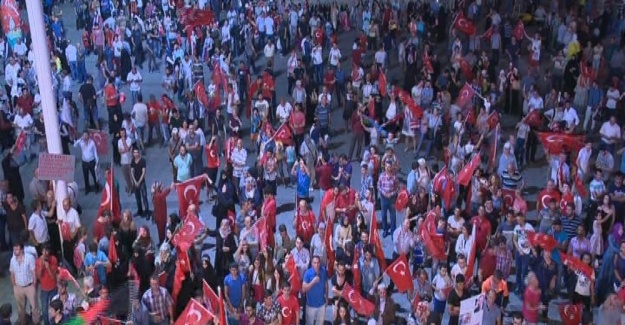 Fethullahçı Terör Örgütü’nün (FETÖ) 15 Temmuz’daki darbe girişiminin ardından vatandaşlar meydanları doldurmaya devam ediyor. Darbe girişimini önleyen halkın Taksim’de demokrasi nöbeti türkülerle, büyük bir coşkuyla devam ediyor. Taksim’deki coşkulu kalabalık, 15 Temmuz’dan bu yana yanlarında getirdikleri Türk bayraklarıyla demokrasi nöbetini büyük bir katılımla sürdürüyor.