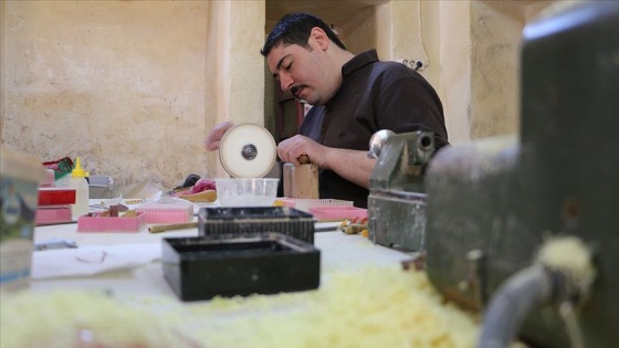 Şanlıurfa'nın Merkez Eyyübiye ilçesinin Haleplibahçe Mahallesi'ndeki atölyesinde ustasından öğrendiği tekniklerle tespih üreten Sait Gelmiş (32), el sanatlarının devam etmesi için çaba harcıyor.