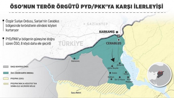 Özgür Suriye Ordusu (ÖSO), Suriye nin Türkiye sınırındaki Cerablus bölgesinde düzenlediği operasyonlarda, terör örgütü PYD/PKK kontrolündeki 8 köyü kurtardı.