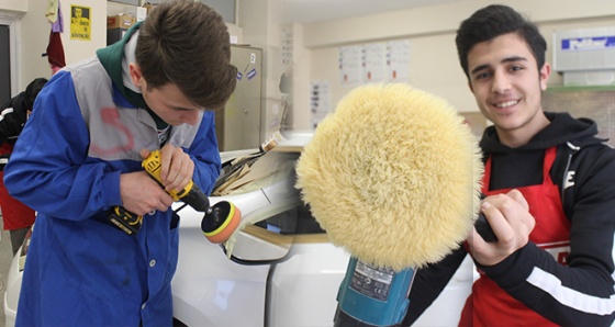 Bursa Ticaret ve Sanayi Odası, 15 Temmuz Şehitleri Meslek Eğitim ve Öğretim Külliyesi, Şehit Ömer Halisdemir Mesleki ve Teknik Anadolu Lisesi Motorlu Araç Teknolojileri Bölümü Otomotiv Boya Dalı öğrencileri, okulda otomobillerin detaylı temizliğini yapıyor.