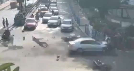 Korkunç görüntülerin adresi Hindistan. Aşırı hızlı olduğu tahmin edilen bir otomobil, kontrolden çıkarak önce motosiklet sürücülerine çarptı, ardından yolun karşı tarafında bekleyen yayaların arasına daldı.