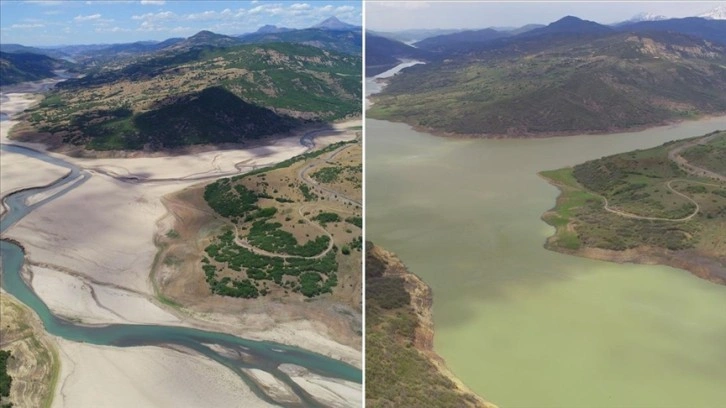 Barajdaki su miktarında bir yıllık sürede yaşanan bu değişim AA ekibi tarafından dronla görüntülendi.