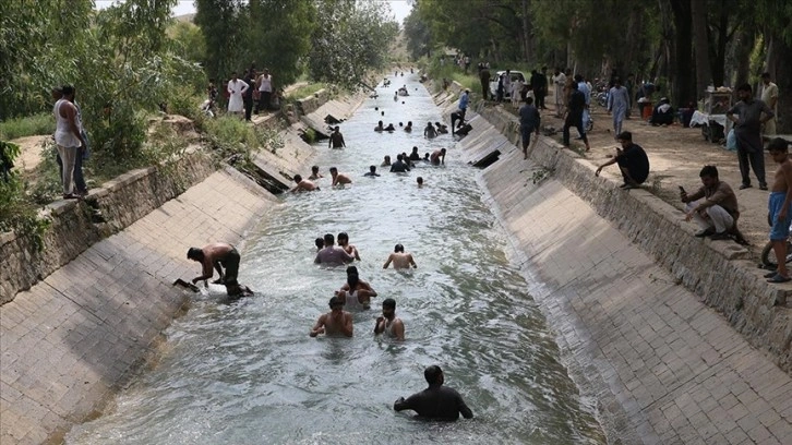 İslamabad'a yakın Teksila bölgesinde sıcak havadan korunmak isteyen onlarca kişi sulama kanalında serinledi.