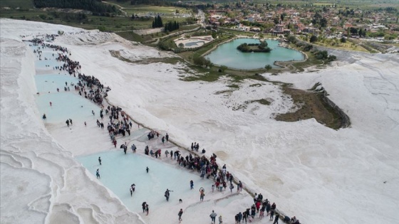 Pamukkale'ye gelen yerli ve yabancı turistler, travertenler üzerinde yürüdü, hatıra fotoğrafı çektirdi, bazıları ise antik havuzda termal suyun keyfini çıkardı.