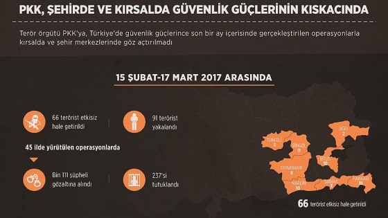 Kırsalda olumsuz hava şartlarına rağmen gerçekleştirilen, jandarma ve emniyet unsurları ile güvenlik korucularının katılımıyla düzenlenen hava destekli operasyonlara binlerce güvenlik personeli katılırken, bir ayda 66 PKK'lı etkisiz hale getirildi, 91 terörist yakalandı.