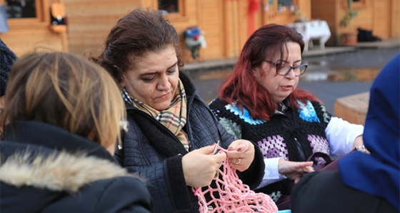 Eline tığları alan kadınlar Atakent'te bulunan Küçükçekmece Belediyesi Hünerli Eller Çarşısına gelerek bez torba ve file yapmaya başladı.