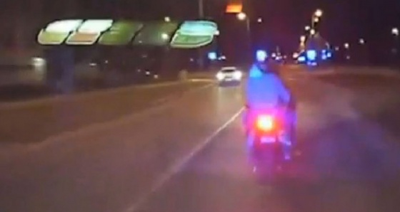 Estonya’da kaydedilen görüntülerde, polisin üzerinde 2 kişinin bulunduğu motosikleti takip ettiği görülüyor. Takip uzayınca, polis motosiklete arkadan çarpıyor. Kendilerini yerde bulan şahıslar kıskıvrak gözaltına alınırken olay polis aracının kamerasına yansıyor.