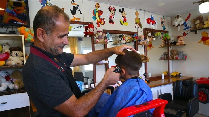 Resim ve oyuncaklarla renklendirdiği iş yerinde depremzede çocukları tıraş ediyor