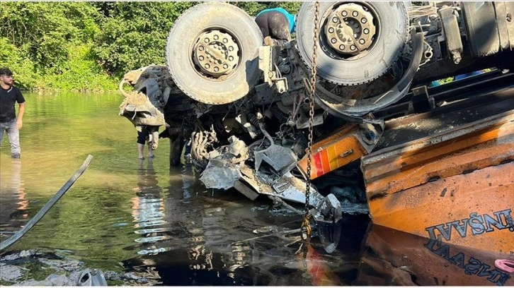 Kalkandere ilçesine bağlı Kayabaşı köyünde Hakan K. yönetimindeki plakası öğrenilemeyen kamyon, sürücüsünün direksiyon hakimiyetini kaybetmesiyle yol kenarındaki bariyerleri aşıp dereye düştü.