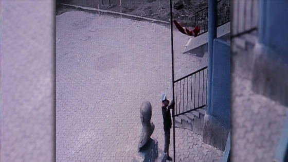 Ağrı Güzel Sanatlar Lisesi 9. sınıf öğrencisi Mert'in, okulun bahçesine girişi ve bayrağı göndere çekmesi okulun güvenlik kameralarına yansıdı.