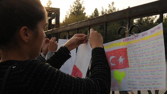 Türk bayraklarıyla süslenen mektup ve şiirler, 24 Kasım Öğretmenler Günü'nde Kaymakam Safitürk'ün ilçede bir süre öğretmenlik yapan eşi Ayşegül Safitürk'e ulaştırılacak.