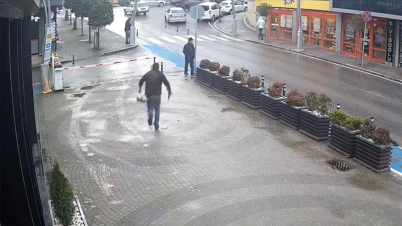 Araçtan inen kişi, belediye binasına girdiği sırada elindeki koltuk değneğiyle koşarak kaçmaya başladı.