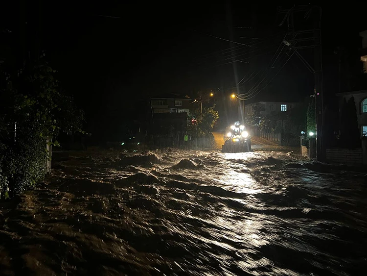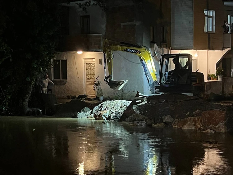 İhbar üzerine 22 personelle bölgeye yönlendirilen Kocaali Belediyesi ve SASKİ ekipleri, iş makineleriyle suları tahliye etmeye çalışıyor.
