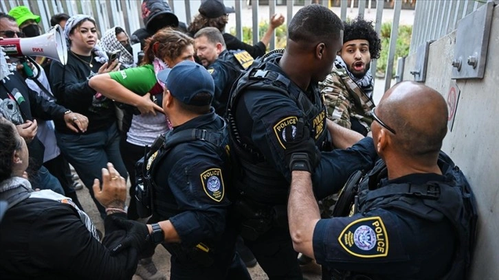 "Özgür Filistin" sloganları atan göstericilerden bir kısmı kendilerini kapılara bağladı.
