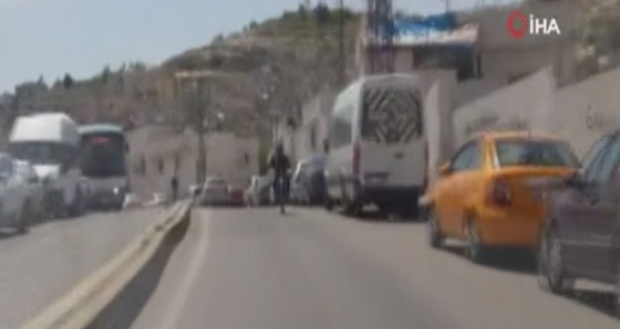 Eyyübiye ilçesine bağlı Yakubiye Mahallesi'nde plakası ve sürücüsü belirlenemeyen bir motosikletli, yaklaşık 60 kilometre yokuş yukarı ilerlediği yolda akrobatik hareketler yaptı. Hem kendisinin hem de arkasında oturan çocuğun hayatını hiçe sayan motosikletli trafiği de tehlikeye attı. Yaklaşık 2 kilometre devam eden tehlikeli yolculuk sonrası ters yine giren motosikletli genç, herhangi bir kaza yaşanmadan yolculuğun tamircide sonlandırdı. Tehlikeli anlar bir başka sürücü tarafından cep telefonu kamerası ile kaydedildi.