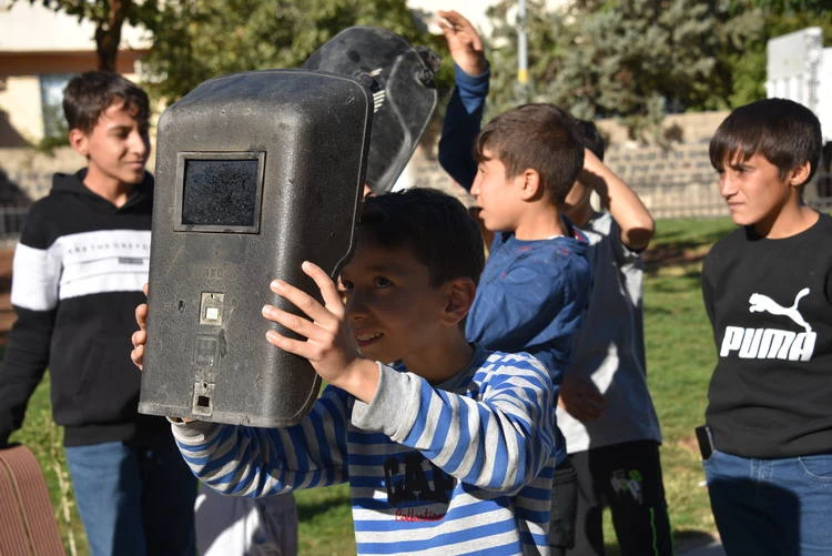 Kaynak yaparken kullandığı maskeyi alan Yılmaz, güneş tutulmasını parktaki çocuklar ve kardeşleriyle birlikte izledi.