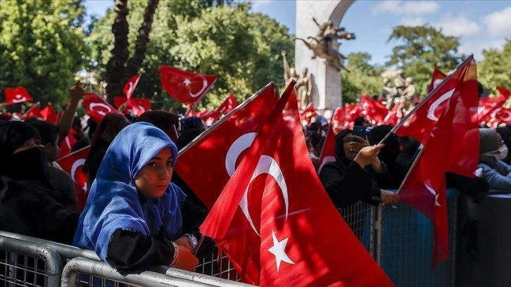 Etkinlik alanına Türk bayraklarının yanı sıra Gazi Mustafa Kemal Atatürk ile Cumhurbaşkanı Recep Tayyip Erdoğan'ın fotoğrafları asıldı.