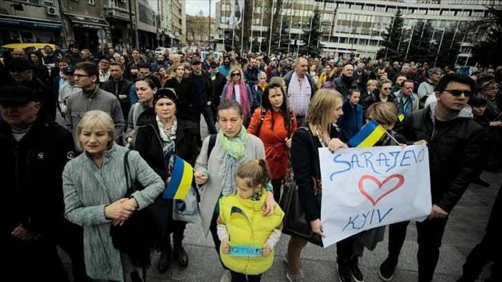 Saraybosna Devlet Tiyatrosu önünde toplanan göstericiler, "Ukrayna halkının yanındayız" mesajları verdi.