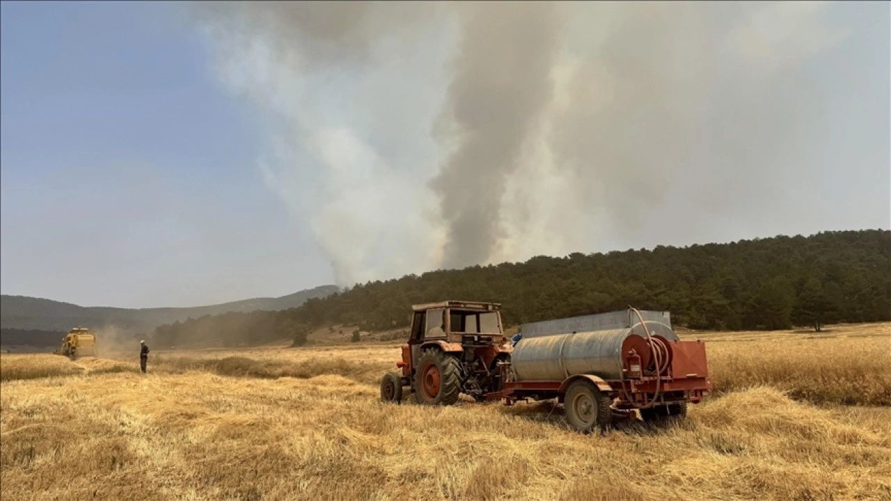Sarıcaova köyü yakınlarında devam eden orman yangını nedeniyle tarlalarına ekili hububatın hasadını yapmak isteyen bazı çiftçiler, işbirliğiyle tarlalarındaki mahsulü topluyor.