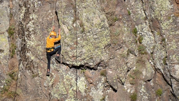 Beş kişilik grup, güvenlik önlemleri aldıktan sonra özel ekipmanlarla yaklaşık 70 metrelik kayalıktan aşağı indi, daha sonra tırmanış yaptı.