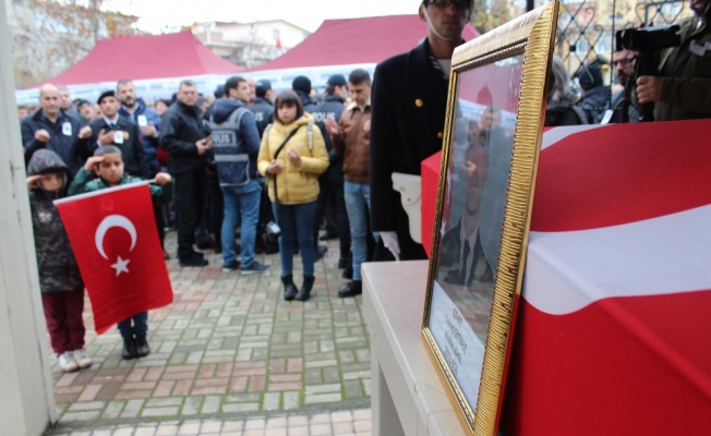 İkindi namazına müteakiben kılınan cenaze töreninde şehidin naaşının yanına gelen 2 çocuk dakikalarca bir eliyle asker selamı yapıp diğer ellerinde tuttukları Türk Bayrağı ile beklediler.