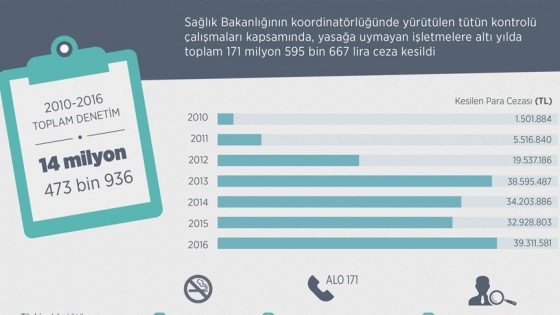 Sağlık Bakanlığının koordinatörlüğündeki tütün kontrolü çalışmaları kapsamında, son altı yılda sigara yasağına uymayan işletmelere toplam 171 milyon 595 bin 667 lira ceza verildi.