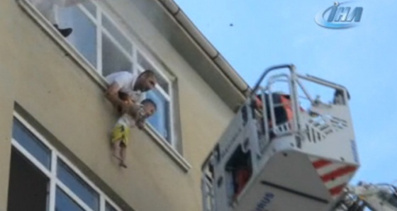 İhbar üzerine olay yerine sevk edilen Silivri İtfaiye ekipleri kısa sürede olay yerine gelerek 5'inci kattan sarkıtılan küçük çocuğu ve annesini kurtardı.