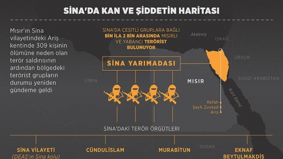 Sina'da en etkin terör grubu "Ensar Beytulmakdis", 2014'te terör örgütü DEAŞ'a biat ettikten sonra "Sina Vilayeti" adını aldı. Yarımadanın güneyinde turizmin yoğunluğu nedeniyle güvenlik üst seviyede tutuluyor. örgütlerin faaliyet alanları daha çok yarımadanın kuzeyindeki alanda meydana geliyor. Söz konusu grupların, Filistin'in Gazze sınırına yakın Refah, Şeyh Zuveyd ve Ariş üçgeninde yoğun oldukları gözleniyor.