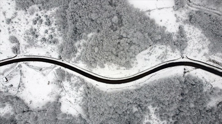Çangal Dağı'nda kar yağışıyla oluşan kış manzaraları dron ile görüntülendi.