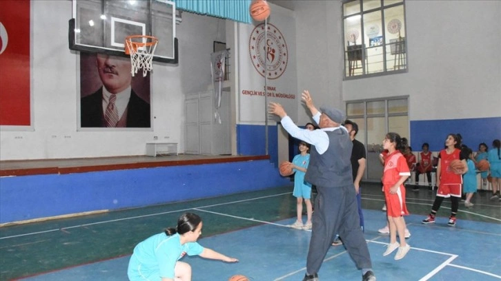 Gündoğdu Mahallesi'ndeki okulda görevli, 6 çocuk babası Dekçi, basketbol oynayan öğrencilere yöresel kıyafetleriyle eşlik ediyor.