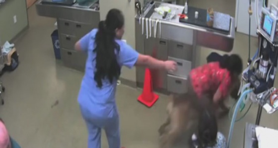 ABD'de veterinere tedavi için getirilen köpek tüm çabalara rağmen sakinleşmedi ve sırtına da aldığı kadınla veterinerden böyle firar etti.
